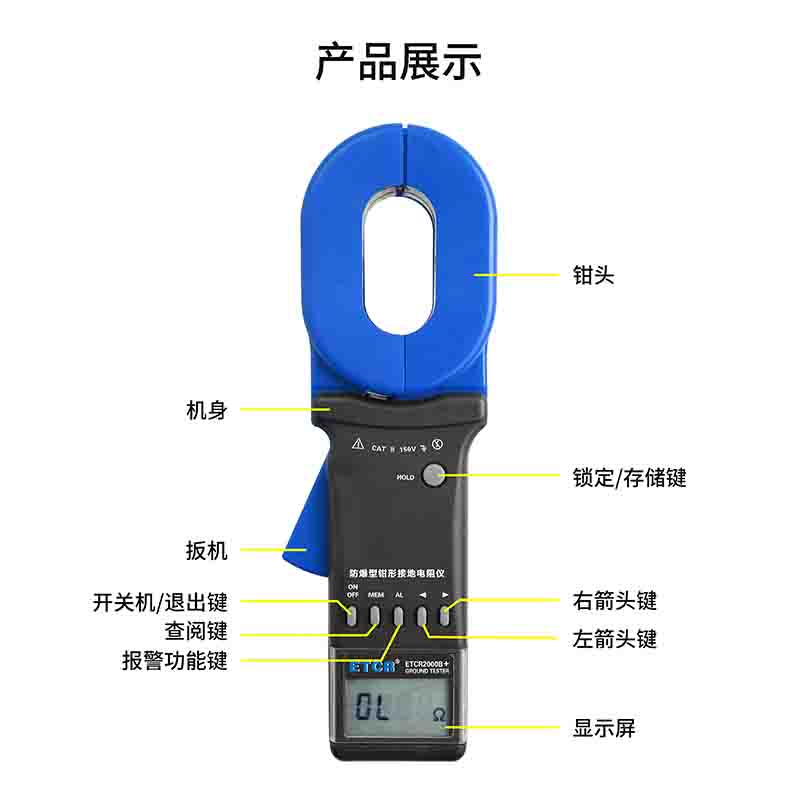 ETCR2000B+防爆型鉗形接地電阻儀又稱防爆型接地電阻表、防爆型鉗形接地電阻測試儀,用于接地電阻、回路電阻測量、接地故障判斷。在測量有回路的接地系統(tǒng)時,不需斷開接地引下線,不需輔助接地極,安全快速、使用簡便。鉗形接地電阻儀廣泛應(yīng)用于電力、電信、氣象、油田、建筑及工業(yè)電氣設(shè)備等的接地電阻測量、回路電阻測量。長鉗口特別適宜于扁鋼接地的場所。