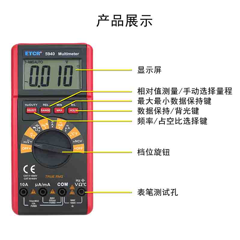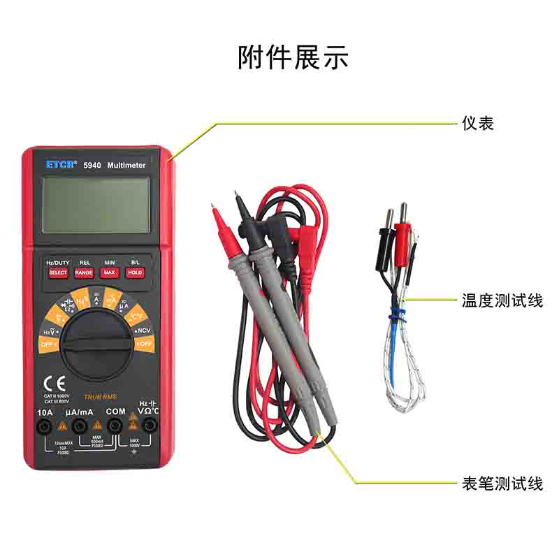 | ETCR5940數(shù)字萬(wàn)用表 | DC 0mV~1000V AC 0mV~1000V | DC 0.0uA~10A AC 0.0uA~10A | 0.0Ω~60MΩ | 0.0nF~9.999mF | 0.0Hz~20MHz | 0℃~1000℃ |