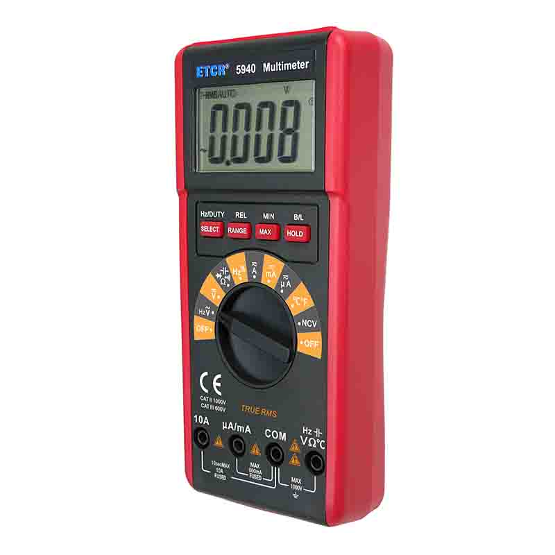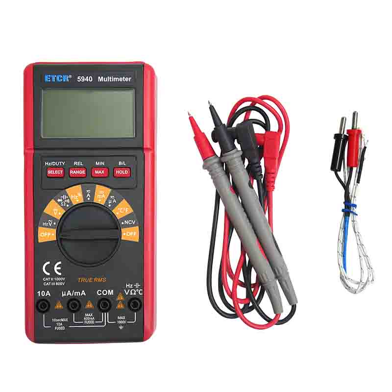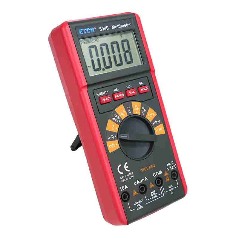 ETCR5940數(shù)字萬(wàn)用表又稱(chēng)數(shù)字萬(wàn)能表、智能萬(wàn)用表,是一款3 5/6位便攜式自動(dòng)量程數(shù)字多用表,可測(cè)量交流電壓真有效值(TRMS)、直流電壓、交流電流真有效值(TRMS)、直流電流、電阻、頻率、溫度、電容、通斷測(cè)試、二極管正向壓降等。該儀表結(jié)構(gòu)精巧、操作容易、攜帶方便,是電工電子測(cè)量之理想工具。