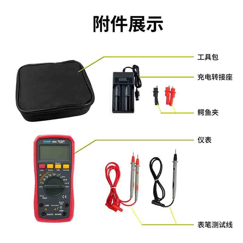 | ETCR5930數(shù)字萬用表 | DC 0.0mV~600V AC 0mV~600V | DC 0.0uA~10A AC 0.0uA~200mA | 0.0Ω~20MΩ | 0.0nF~2mF | 0.0Hz~20MHz | 0℃~1000℃ |