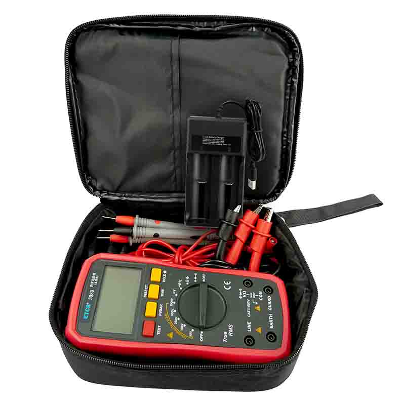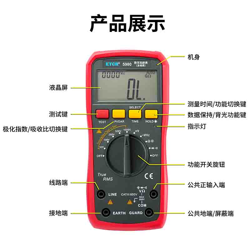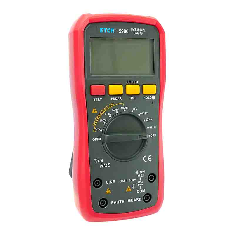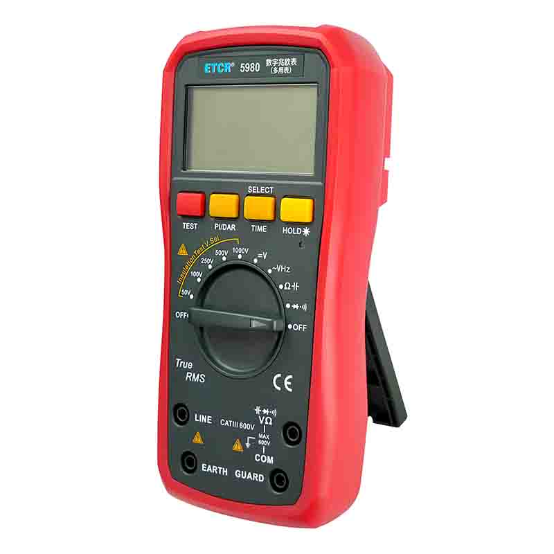 ETCR5980數(shù)字兆歐表(多用表)是一款數(shù)字式兆歐表+數(shù)字萬用表。絕緣電阻測試電壓可選50V/100V/250V/500V/1000V。它可適時監(jiān)測絕緣電阻測試電壓,有效避免因輸出電壓不符合額定值要求而造成的誤判。儀表絕緣電阻測量最高可達(dá)到20GΩ,可根據(jù)需要設(shè)置測量時間,測量完畢后自動保持測量結(jié)果。數(shù)字多用表功能有交直流電壓、電阻、電容、頻率、二極管及通斷測量等。本產(chǎn)品適用于測量變壓器、電機、電纜、開關(guān)、電器等各種電氣設(shè)備及絕緣材料的絕緣電阻,對各種電氣設(shè)備進(jìn)行保養(yǎng)維修、試驗及檢定。它結(jié)構(gòu)精巧,攜帶方便,是您理想的電工、電子測試儀表。