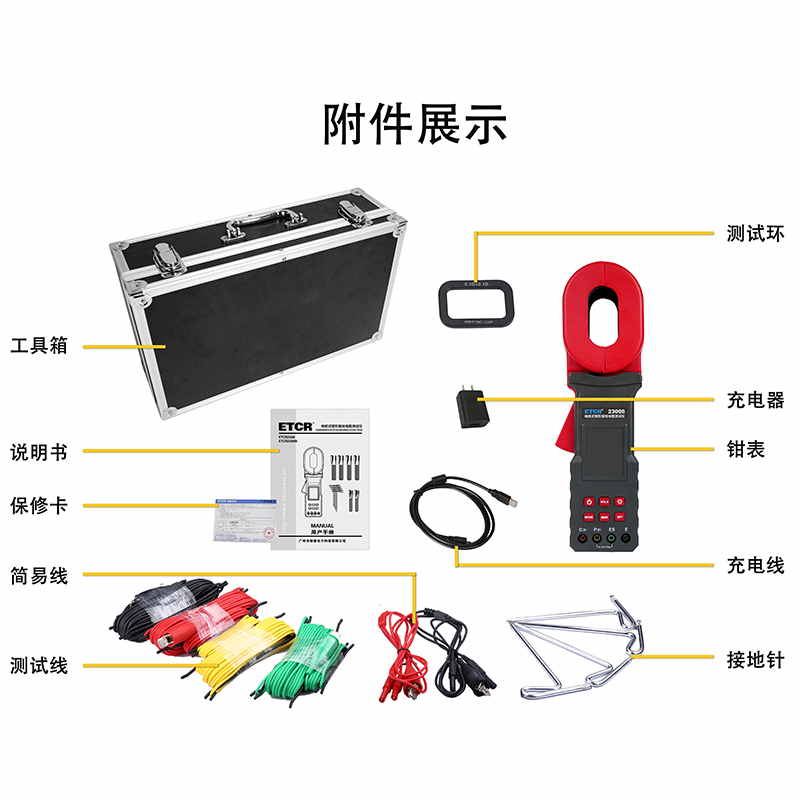接地電阻測量、回路電阻測量、土壤電阻率測量、對地電壓測量,接地線漏電流測量,判斷接地故障。