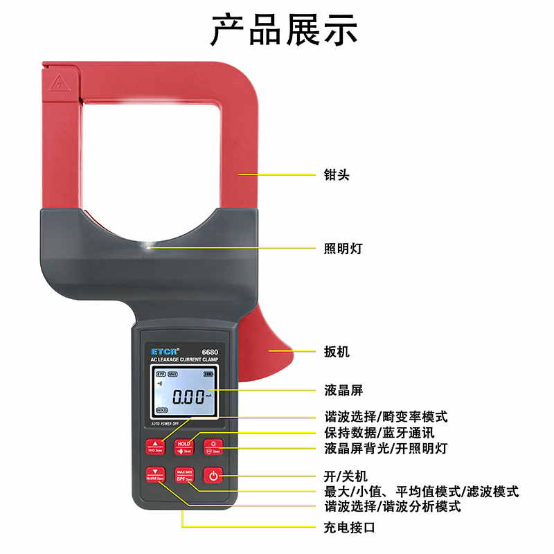 ETCR6680鉗形漏電流表可測試40Hz~1kHz頻率范圍的電流。鉗表還具有背光、手電筒、數(shù)據(jù)存儲(chǔ)、藍(lán)牙通訊等功能。鉗表使用大容量鋰電池type-c充電口,是一款新型的電工安全檢測必備工具。