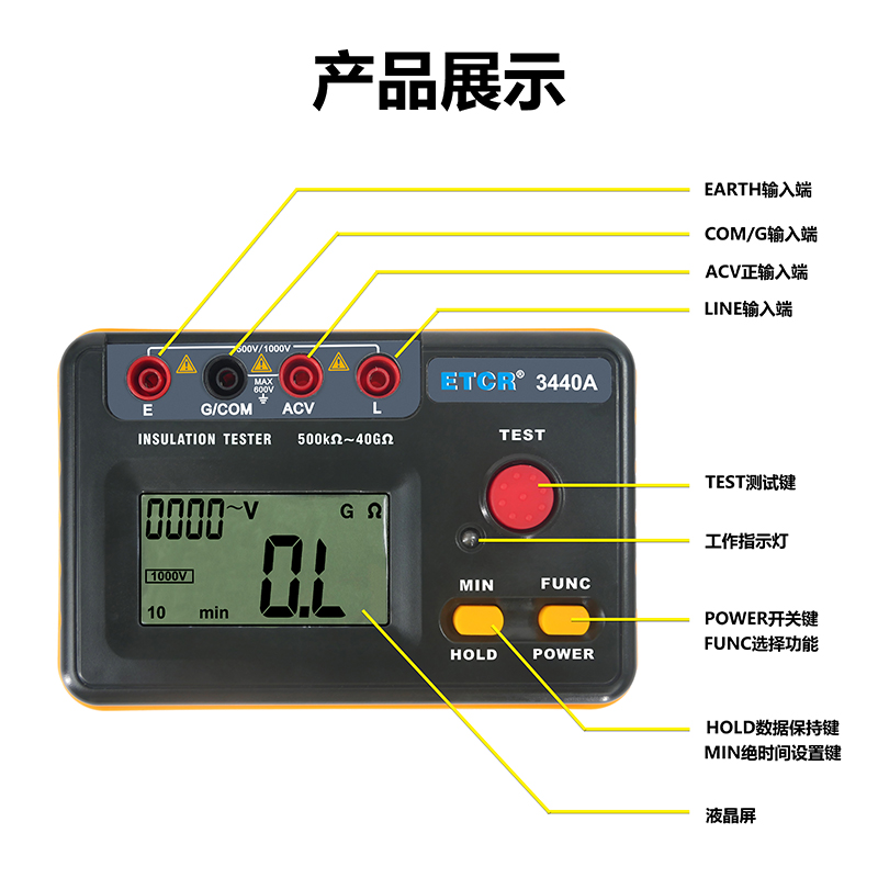 | ETCR3440A絕緣電阻表 | 500V、1000V | 0.5MΩ~40GΩ | 1mA MAX | AC:0V~600V |