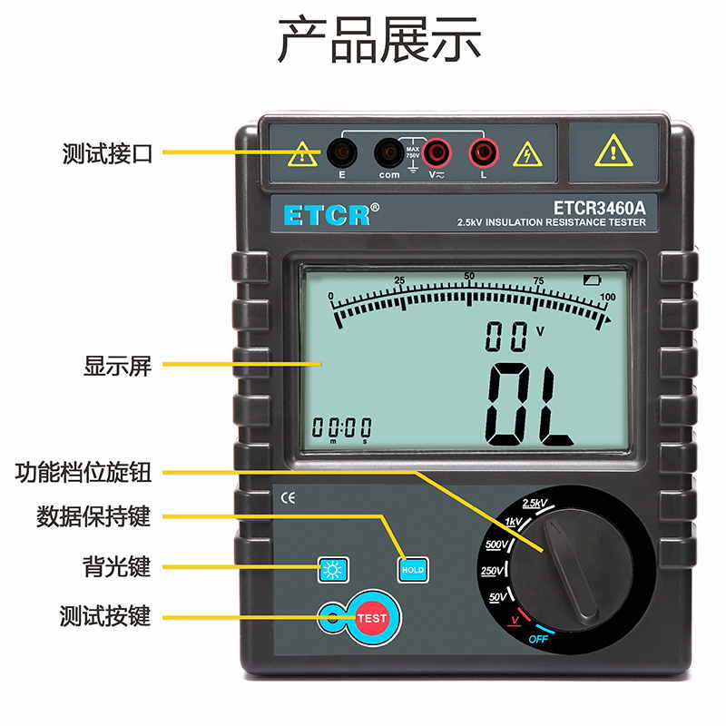 ETCR3460A絕緣電阻表又名兆歐表、絕緣電阻測(cè)試儀,用于絕緣電阻測(cè)試。儀表具有LCD大屏幕帶背光顯示、數(shù)據(jù)保持、自動(dòng)放電、自動(dòng)關(guān)機(jī)等功能。儀表具有測(cè)試計(jì)時(shí),電壓監(jiān)測(cè)功能,回路電壓大于36V時(shí),儀表將禁止測(cè)試以保護(hù)被測(cè)物及人員安全。儀表功能操作簡(jiǎn)易,絕緣電阻值,測(cè)試時(shí)間,輸出電壓同屏顯示,具備交流電壓、直流電壓測(cè)試功能。