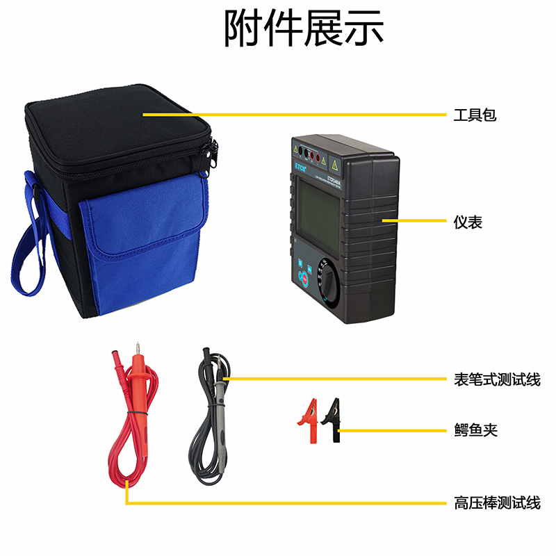 1、5檔輸出電壓50V、250V、500V、1000V、2500V,寬量程0.1MΩ~200GΩ,最大短路電流2mA。