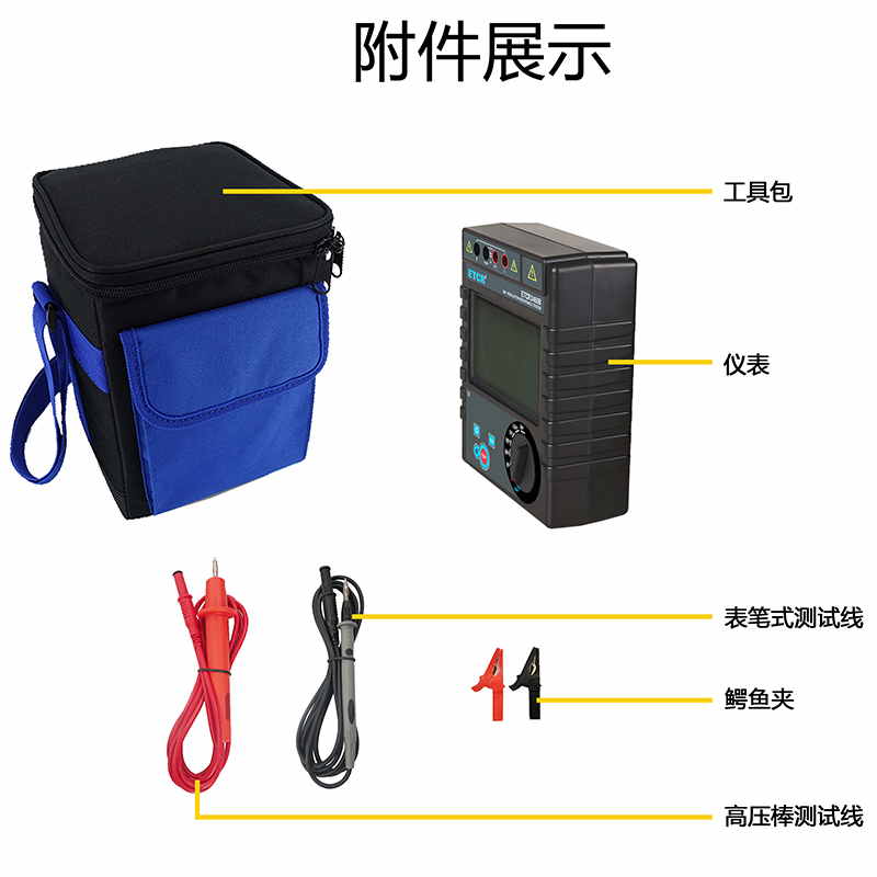 | ETCR3490B高壓絕緣電阻測試儀 | 500V,1000V,2500V,5000V,10000V | 0.2MΩ~4.00TΩ | 5mA MAX | AC 750V;DC 1000V |