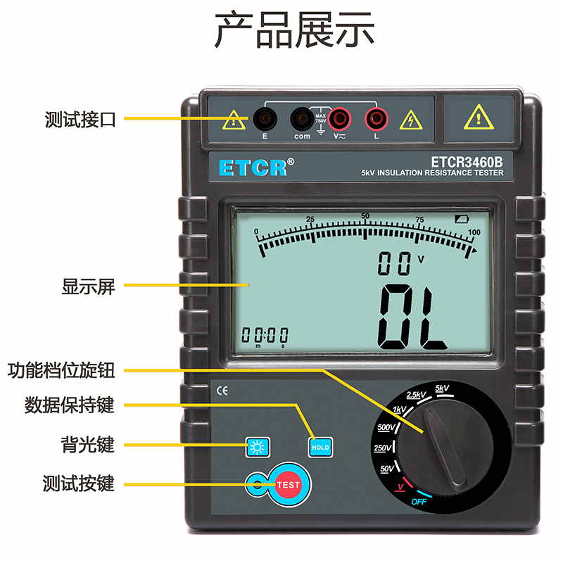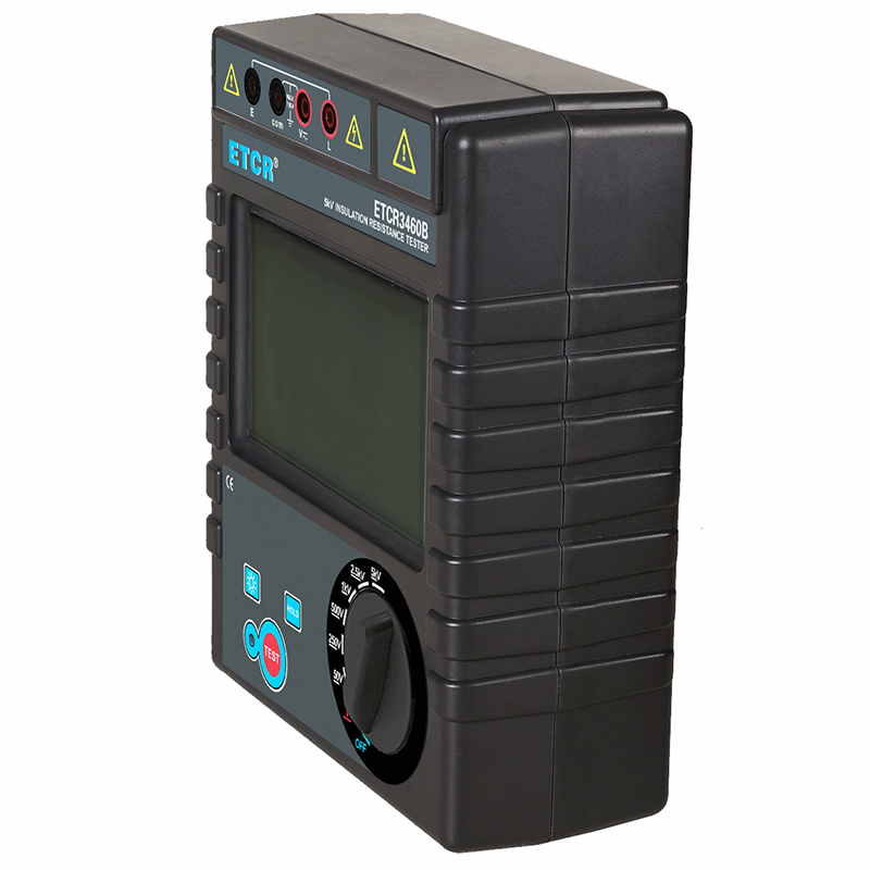 ETCR3460B絕緣電阻表又名兆歐表、絕緣電阻測試儀,用于絕緣電阻測試。儀表具有LCD大屏幕帶背光顯示、數(shù)據(jù)保持、自動放電、自動關(guān)機(jī)等功能。儀表具有測試計(jì)時,電壓監(jiān)測功能,回路電壓大于36V時,儀表將禁止測試以保護(hù)被測物及人員安全。儀表功能操作簡易,絕緣電阻值,測試時間,輸出電壓同屏顯示,具備交流電壓、直流電壓測試功能。