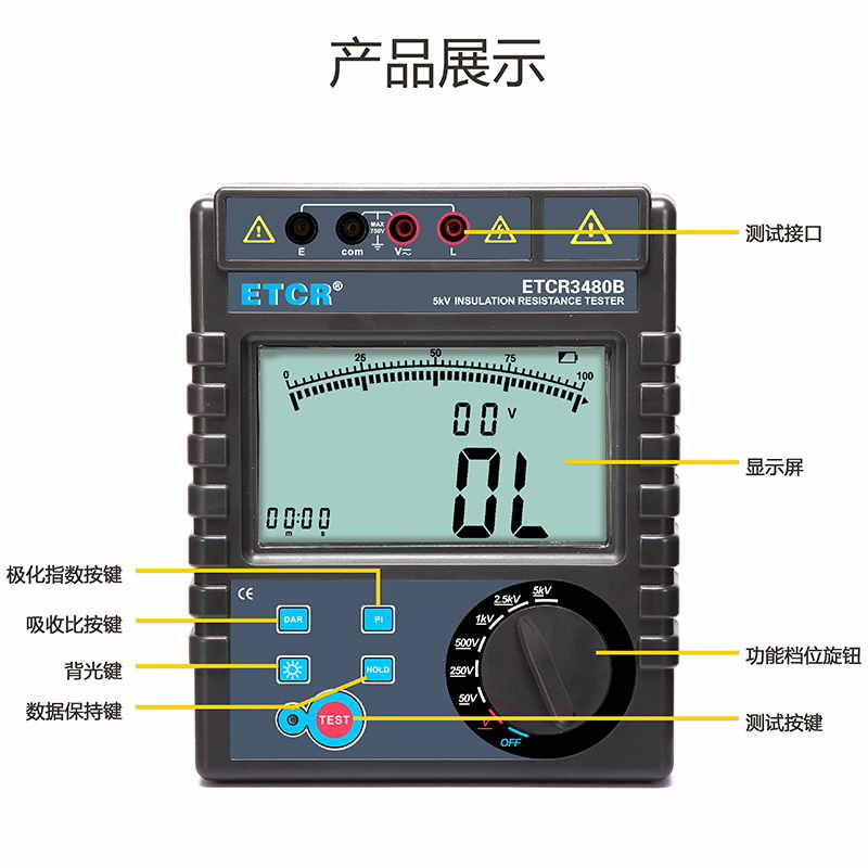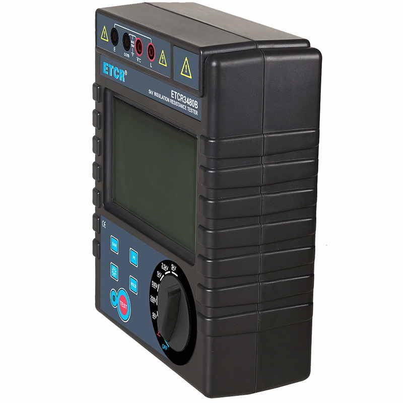 ETCR3480B絕緣電阻表又名兆歐表、絕緣電阻測試儀,用于絕緣電阻測試、吸收比、極化指數(shù)測試、交直流電壓測試。儀表具有LCD大屏幕帶背光顯示、數(shù)據(jù)保持、自動放電、自動關(guān)機(jī)等功能。儀表具有測試計(jì)時(shí),電壓監(jiān)測功能,回路電壓大于36V時(shí),儀表將禁止測試以保護(hù)被測物及人員安全。儀表功能操作簡易,絕緣電阻值,測試時(shí)間,輸出電壓同屏顯示,具備交流電壓、直流電壓測試功能。
