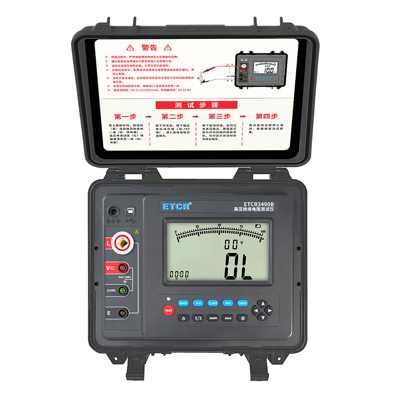 ETCR3490系列高壓絕緣電阻測(cè)試儀整機(jī)美觀,量程寬,精度高,分辨率高,操作便捷,攜帶方便,準(zhǔn)確可靠、性能穩(wěn)定,抗干擾能力強(qiáng)。而且具有防震、防塵、防潮結(jié)構(gòu),是電信、電力、氣象、機(jī)房、油田、機(jī)電安裝和維修以及利用電力作為工業(yè)動(dòng)力或能源的工業(yè)企業(yè)部門(mén)常用而必不可少的儀表。適用于測(cè)量各種絕緣材料的電阻值及變壓器、電機(jī)及電器設(shè)備等的絕緣電阻。