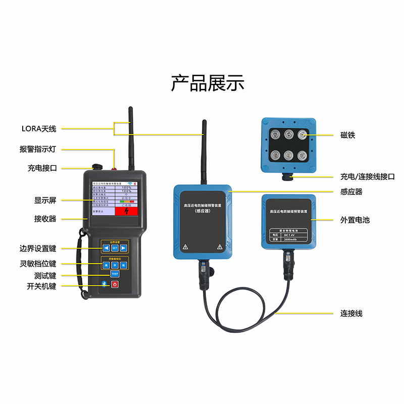 5、聲光報警功能:觸發(fā)報警功能時,接收器報警指示燈連續(xù)閃爍,蜂鳴器發(fā)出“嗶-嗶-嗶”,揚聲器播報語音提示”有電危險,請勿靠近”。