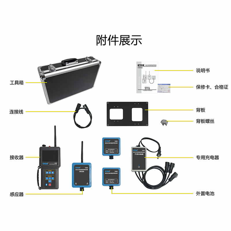 ETCR1900高壓近電防觸碰智能預警裝置由感應器、外置電池、接收器、藍牙APP組成。感應器采用非接觸感應技術用于監(jiān)測高壓電場,接收器接受感應器發(fā)送的監(jiān)測信號,當電場強度達到設定的報警值時,觸發(fā)報警功能發(fā)出聲光報警及語音報警。感應器與接收器采用無線通訊,傳輸距離200米。裝置具有報警靈敏度調(diào)節(jié)和邊界報警功能,用戶可在接收器設置報警靈敏度或自設定報警距離,以適應復雜電場的環(huán)境。接收器具有485接口及藍牙功能,便于用戶二次開發(fā)。移動終端安裝APP后,可查看報警信號或設置報警參數(shù)。