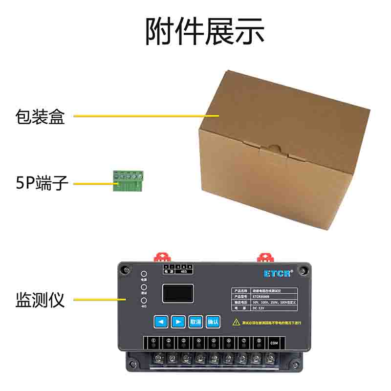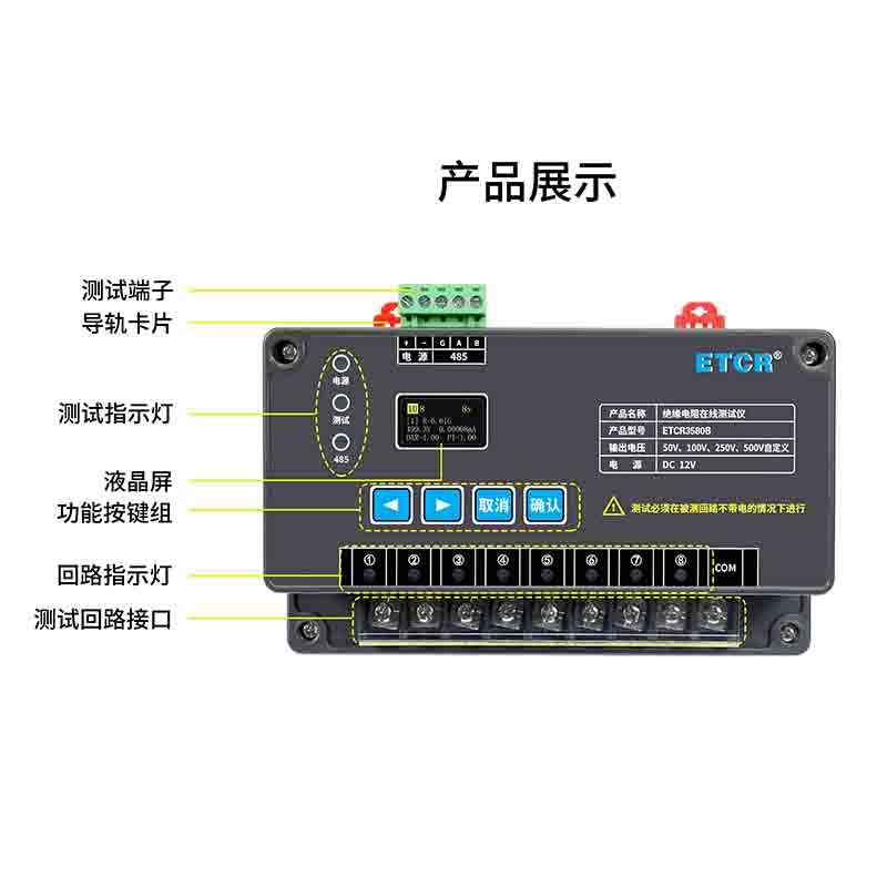 | ETCR3580C絕緣電阻在線(xiàn)監(jiān)測(cè)儀 | 50V、100V、250V、500V、1000V、自定義 | 0.1MΩ~20GΩ | 5mA MAX | 1路 | RS485 |