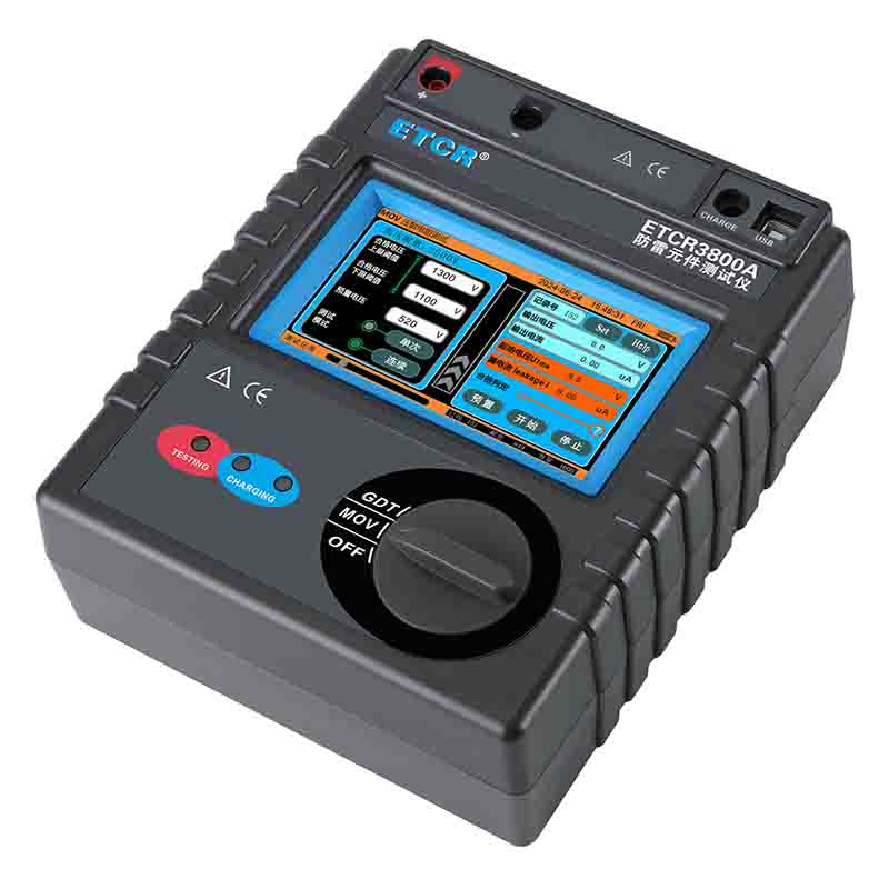 ETCR3800A智能型防雷元件測(cè)試儀又稱(chēng)防雷元件測(cè)試表、SPD現(xiàn)場(chǎng)測(cè)試儀、壓敏電阻測(cè)試儀、浪涌保護(hù)器測(cè)試儀,用于測(cè)量各種壓敏電阻(MOV)、氣體放電管(GDT)、浪涌保護(hù)器(SPD)性能參數(shù)測(cè)試,儀表具有獨(dú)特的高壓短路保護(hù)、過(guò)流保護(hù)功能,專(zhuān)業(yè)級(jí)的參數(shù)設(shè)置功能、高壓限值設(shè)定、升壓速度設(shè)定、合格范圍設(shè)定、合格判斷篩選、自動(dòng)量程調(diào)節(jié)等功能。還具有單件測(cè)試模式、連續(xù)測(cè)試模式功能,特別適合批量元件測(cè)試。儀器廣泛用于避雷器、防雷器、浪涌保護(hù)器、壓敏電阻、金屬陶瓷放電管、真空避雷管等過(guò)壓防護(hù)元件性能參數(shù)的測(cè)試。是氣象防雷、電力、通信、機(jī)電安裝和維修、防雷元件生產(chǎn)廠家、以及工業(yè)企業(yè)部門(mén)常用必備的儀表。