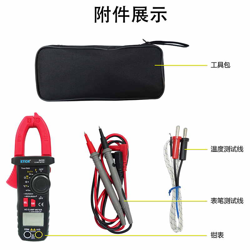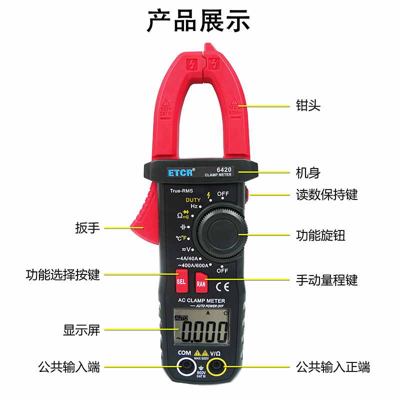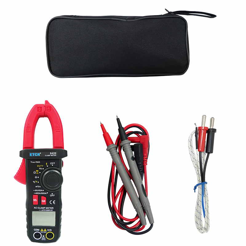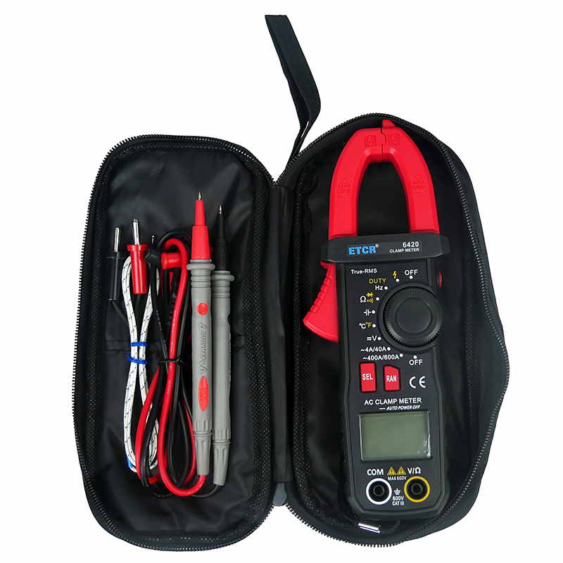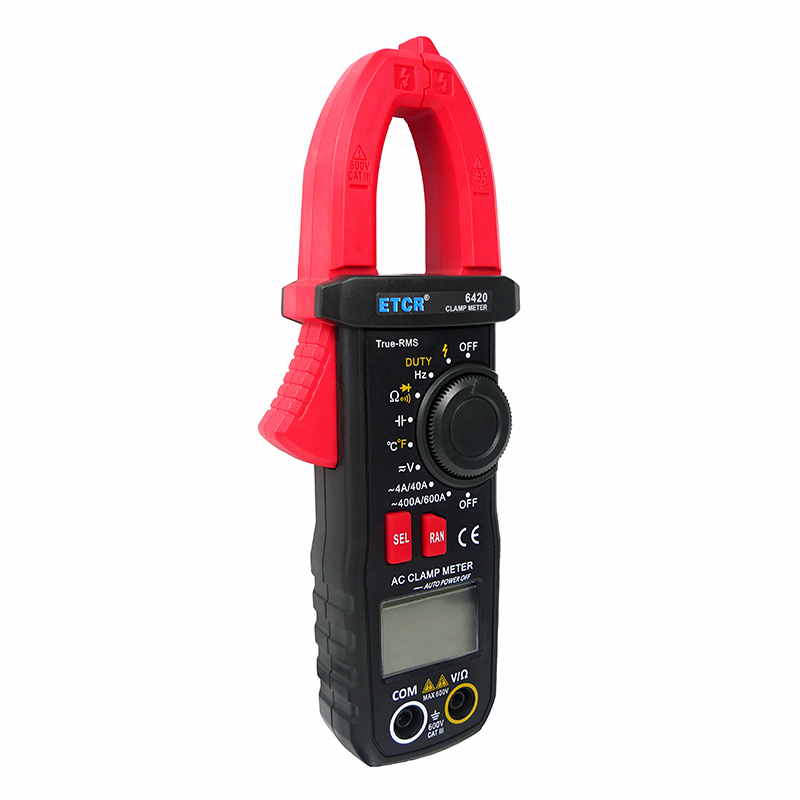 ETCR6420鉗形萬(wàn)用表又稱多功能鉗形電流表,是一種便攜式鉗形數(shù)字多用表,可測(cè)量直流電壓、交流電壓電流真有效值、電阻、頻率、通斷測(cè)試、溫度、二極管正向壓降等參數(shù),電容測(cè)量量程擴(kuò)大到10mF且測(cè)量大電容速度快。該儀表結(jié)構(gòu)小巧、操作容易、攜帶方便,是電氣測(cè)量之理想工具。為用電檢查人員提供一種安全、準(zhǔn)確、便捷的新型電力儀表,是電工安全檢測(cè)的必備工具。