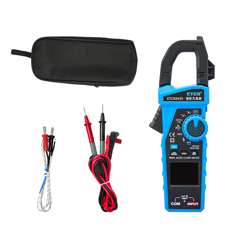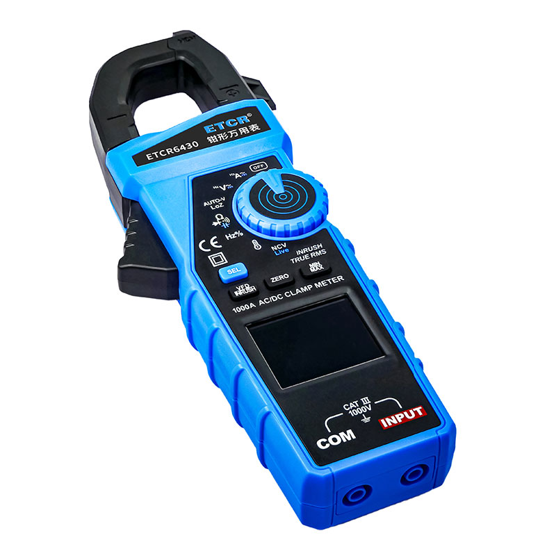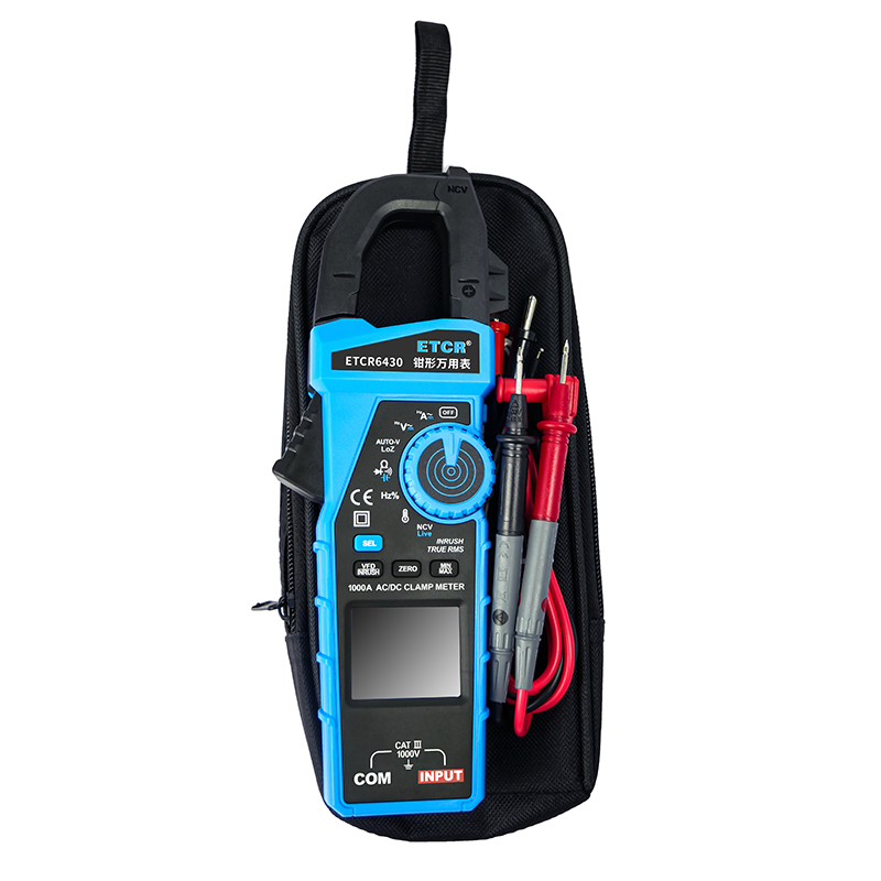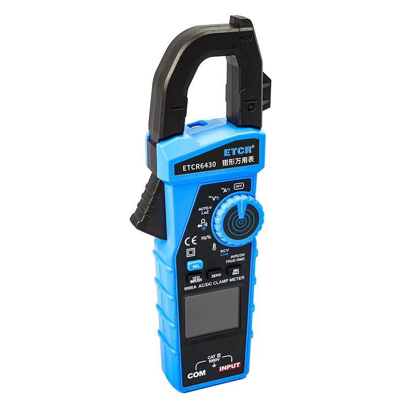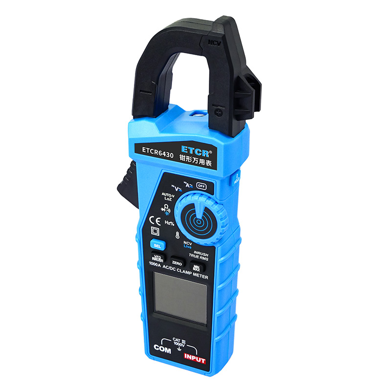 ETCR6430鉗形萬用表可用于測量交直流電流、交直流電壓、電阻、電容、二極管、線路通斷、頻率、百分比、溫度、NCV、Live以及MAX、MIN、HOLD鎖定、INRUSH、VFD、手電筒、自動關機、全量程過載保護、電池電量不足指示等功能。