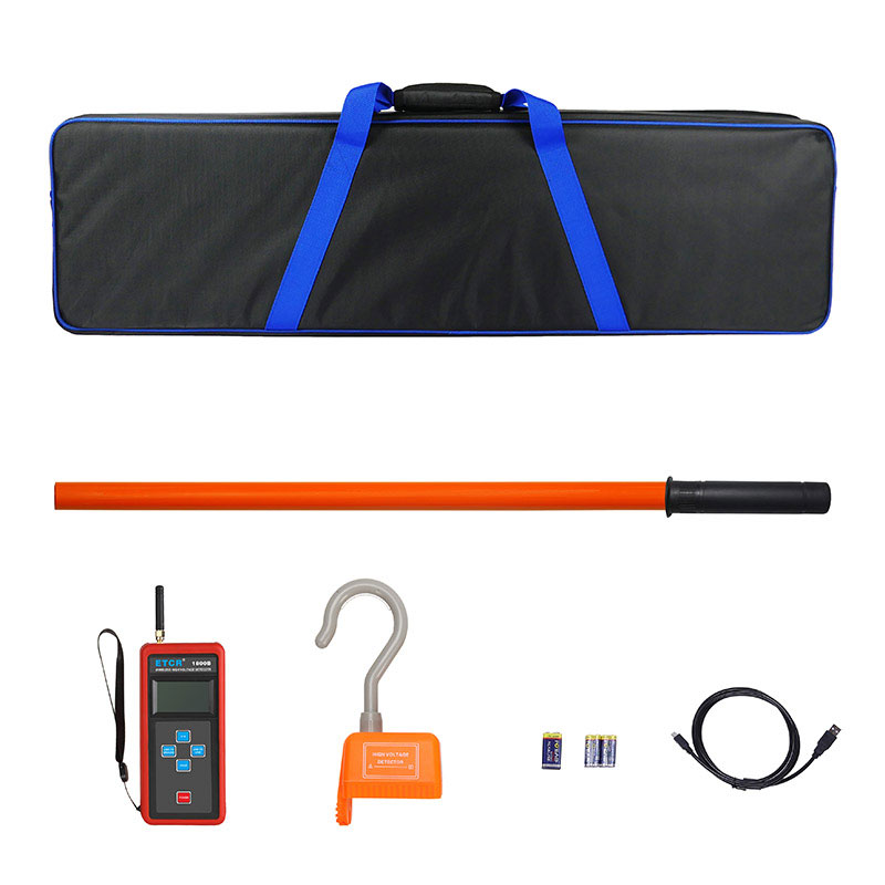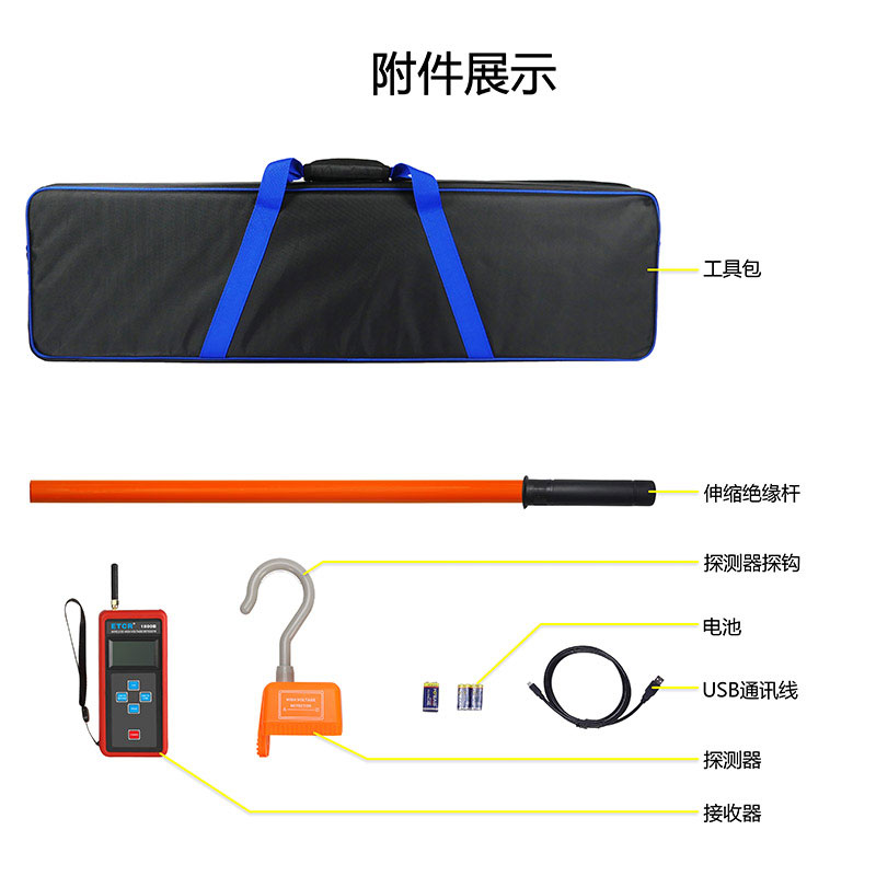 ETCR1800B無線高壓驗電器由接收器、探測器、伸縮絕緣桿、數(shù)據(jù)上傳軟件、USB通訊線等組成,測試時只需用絕緣桿把探測器掛在裸導(dǎo)線上,通過無線信號傳輸即可在手持接收器上讀取電壓值及電流值,一目了然非常直觀,操作非常方便。無線信號直線傳輸距離約30米,探測器有紅色LED和蜂鳴器等聲光報警,使測試更簡單輕松。通過USB通訊接口和上位機軟件存儲數(shù)據(jù)上傳電腦具有歷史數(shù)據(jù)查詢、保存、打印等功能。