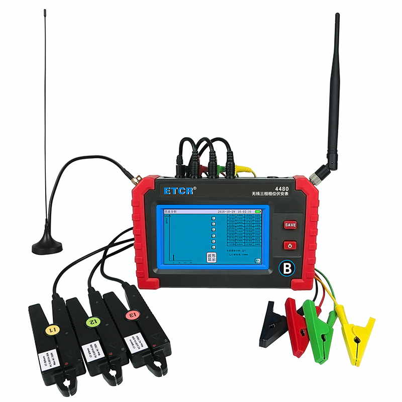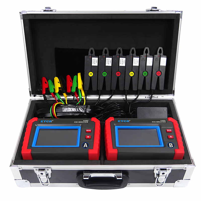 ETCR4480無(wú)線三相相位伏安表又稱三相電力參數(shù)測(cè)試儀、CT負(fù)荷測(cè)試儀、PT負(fù)荷測(cè)試儀,用于變電站內(nèi)不同位置的三相電力參數(shù)測(cè)量、PT無(wú)線核相、PT負(fù)荷測(cè)試、CT負(fù)荷測(cè)試、三相不平衡度測(cè)試、諧波分析等。儀表由2臺(tái)手持終端、6個(gè)電流鉗、2組電壓測(cè)試線等組成,2臺(tái)手持終端具有無(wú)線通訊及GPS通訊,可互設(shè)為主機(jī)或從機(jī),實(shí)現(xiàn)同步測(cè)量變電站內(nèi)不同位置之間電流、電壓、相位等參數(shù)。