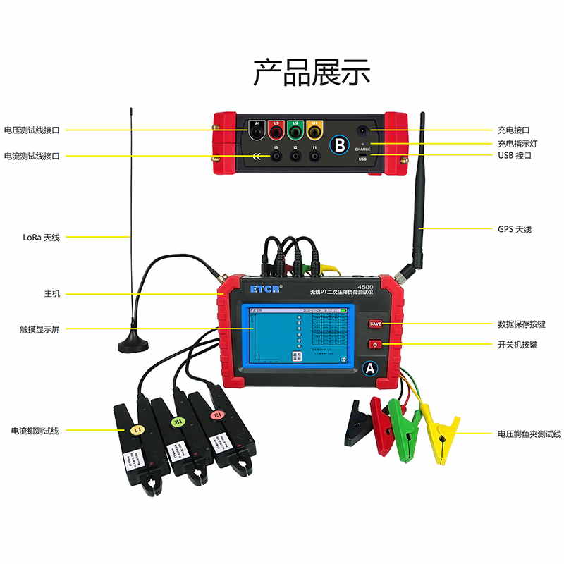 ETCR4500無線PT壓降負荷測試儀采用5寸觸摸彩屏、中文界面、功能直達、自動測量、操作簡易快捷,準確可靠,儀表采用大容量可充電鋰電池、具有數(shù)據(jù)存儲、USB接口數(shù)據(jù)上傳導出等功能,儀表具有支持安卓系統(tǒng)的藍牙通訊,可在手機進行測試或查看測試記錄。本儀器采用專用計量芯片,具備非常高的電參數(shù)測量精度,能夠?qū)崟r顯示待測參數(shù)的變化,同時具備一鍵保存數(shù)據(jù)的功能。產(chǎn)品操作簡單、使用方便、測量快速、穩(wěn)定、結(jié)果可靠,是電力系統(tǒng)電能計量和繼電保護專業(yè),進行二次回路現(xiàn)場檢測的新一代儀表,也廣泛適用于電氣設(shè)備制造、石油化工、鋼鐵冶金、鐵路電氣化、科研教學等部門。