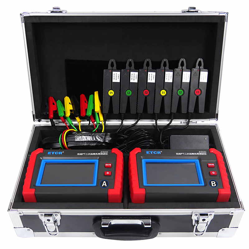 ETCR4500無線PT壓降負荷測試儀又稱PT核相儀、PT負荷測試儀、PT比差測試儀,用于現(xiàn)場在線測試電能計量裝置電壓互感器(以下簡稱 PT)的二次回路壓降,以及PT核相、PT負荷測試、CT負荷測試、三相伏安表、諧波分析等。儀表由2臺手持終端、6個電流鉗、2組電壓測試線等組成,2臺手持終端具有無線通訊及GPS通訊,可互設(shè)為主機或從機,實現(xiàn)同步測量變電站內(nèi)不同位置之間電流、電壓、相位等參數(shù)。
